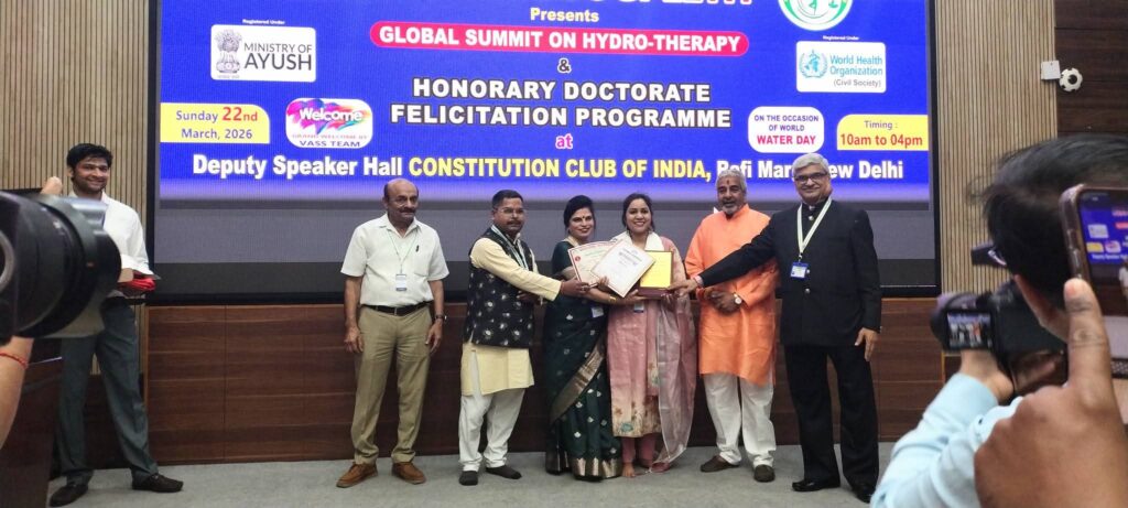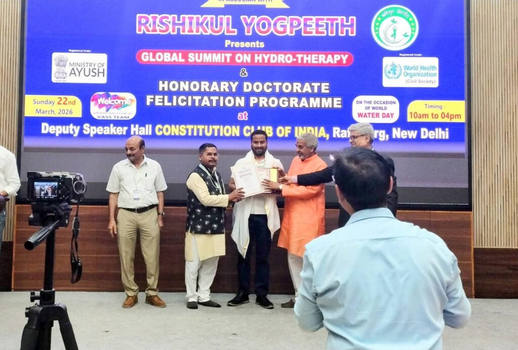 नई दिल्ली- 22 अप्रैल 2026 रविवार को देश की राजधानी नई दिल्ली मे ऋषिकुल योगपीठ और विश्व आरोग्य संवर्धन संस्थान के द्वारा अंतर्राष्ट्रीय जल दिवस पर प्राकृतिक चिकित्सा और जल चिकित्सा पर एक महाआयोजन कांस्टीट्यूशनल क्लब ऑफ इंडिया मे आयोजित किया गया । जिसमे देश के विभिन्न राज्यों से स्वास्थ्य और शिक्षा के क्षेत्र मे बेहतरीन कार्यों के लिए शिक्षकों और समाज सेवकों को सम्मानित किया गया । स्वास्थ्य के क्षेत्र मे उत्कृष्ठ कार्यों के लिए योगाचार्य अरुण जुयाल और उर्मिला शर्मा को योग रत्न से सम्मानित किया गया ।